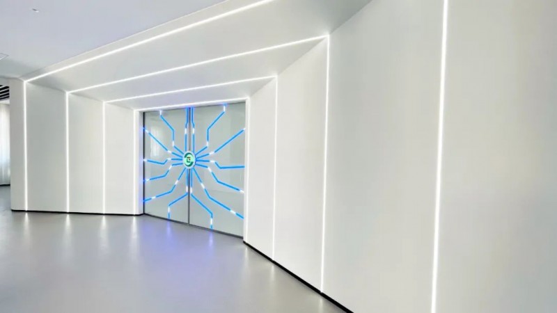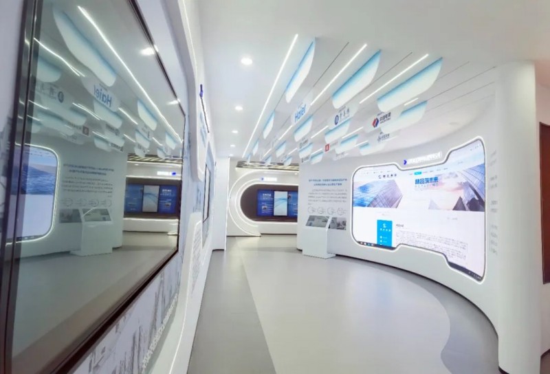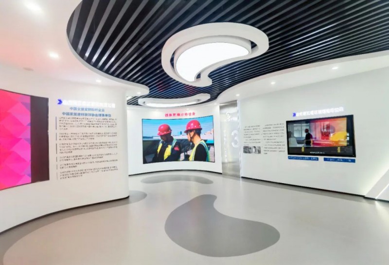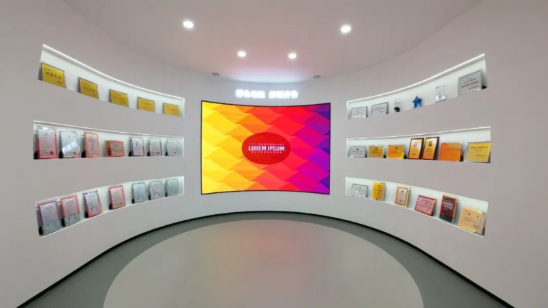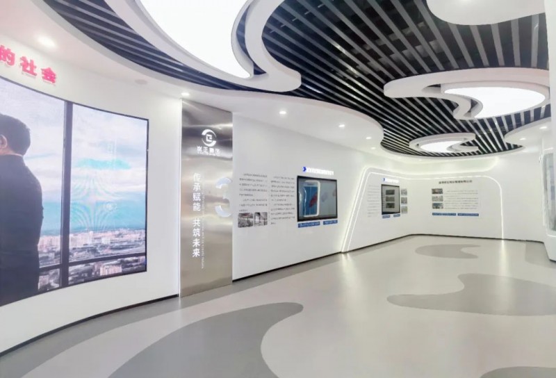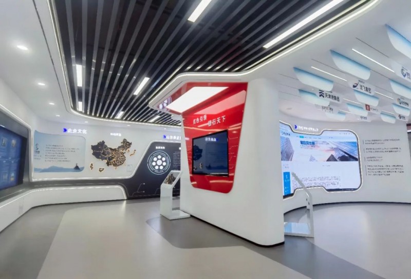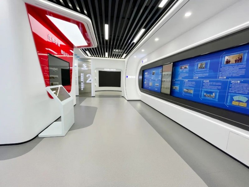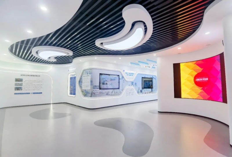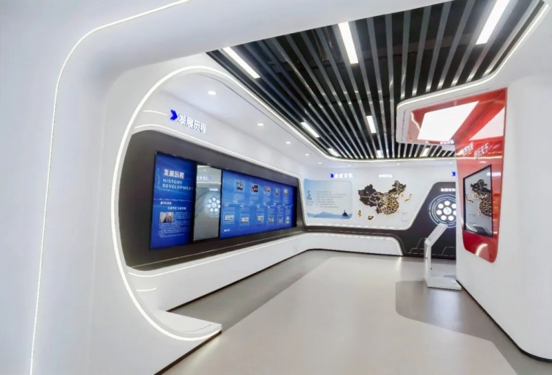 展廳中多處運(yùn)用電子互動(dòng)大屏放映企業(yè)專題片,并且將展廳墻體直角部分改為弧形,與曲面屏呼應(yīng)的同時(shí)增強(qiáng)了空間的整體流動(dòng)性。展廳運(yùn)用統(tǒng)一基礎(chǔ)標(biāo)準(zhǔn)色調(diào),使得整個(gè)展廳風(fēng)格更加統(tǒng)一。在頂部運(yùn)用線性燈與筒燈進(jìn)行融合照明,提升視覺美感。